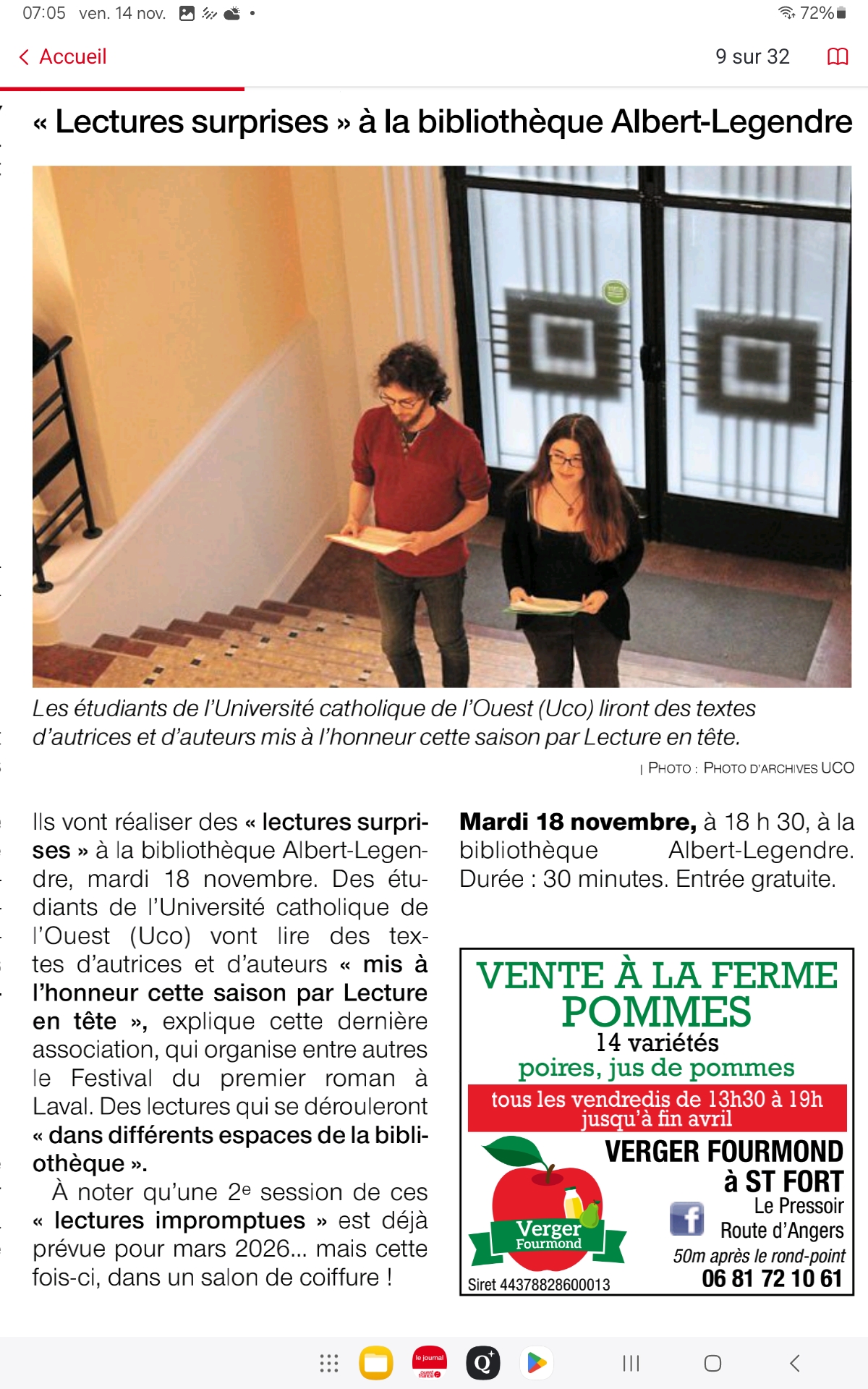 Ouest-France | "Lectures surprises" à la bibliothèque Albert-Legendre | Edition du 14 novembre 2025